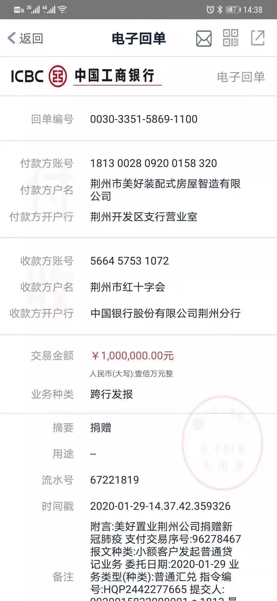 面对疫情,医药用品、消毒物质、防护器材等医疗物资以及人民生活物质的保障非常重要,对此,美好房屋智造(集团)荆州城市公司于1月29日向荆州红十字会捐款100万元,用于防控疫情。